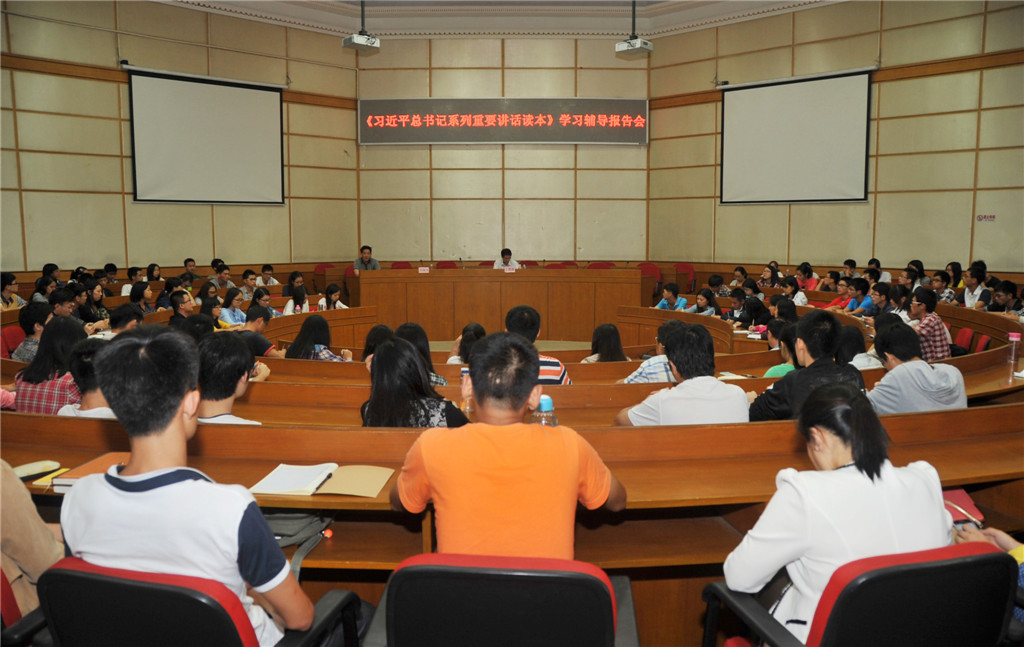11月2日晚,由校黨委宣傳部、組織部共同主辦的“《習近平總書記系列重要講話讀本》學習輔導報告會”在十友樓二樓國際報告廳舉行。應我校邀請,廣東省委宣傳部理論處處長丁晉清教授針對《讀本》內容作了詳細解讀。報告會由宣傳部部長戴永潔主持,各直屬黨支部書記、學院(部)教工黨支部書記、學生黨支部書記和學生黨員干部代表聆聽了報告。
