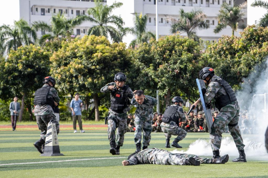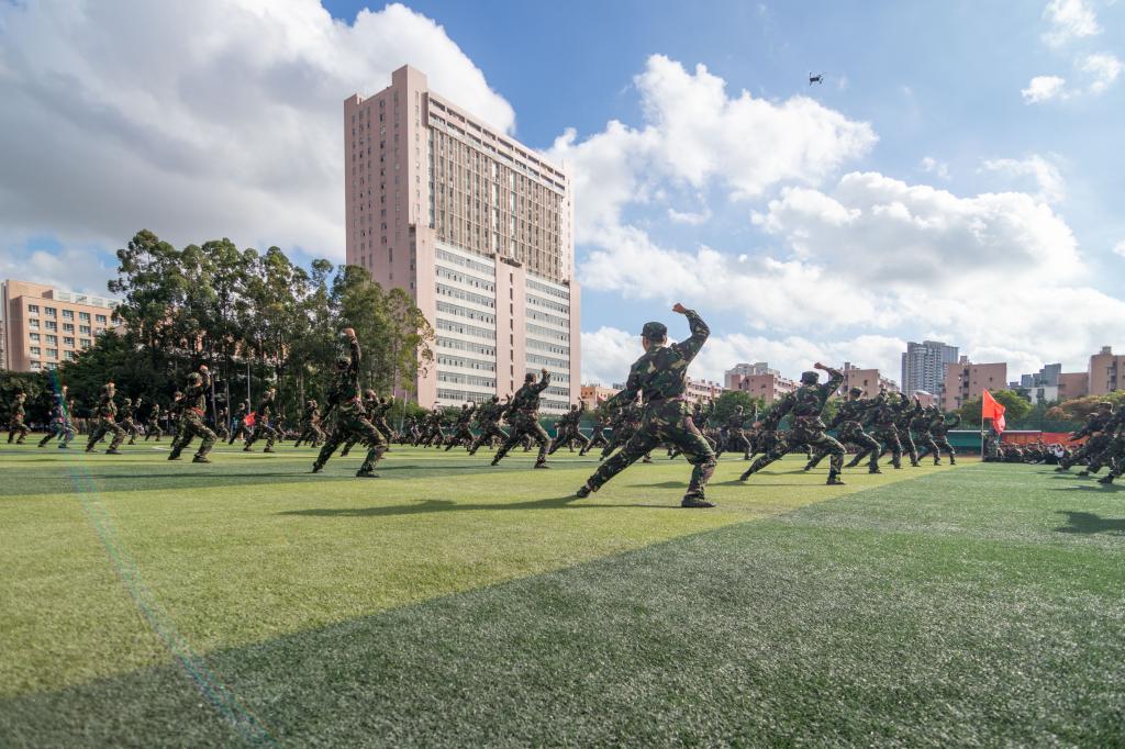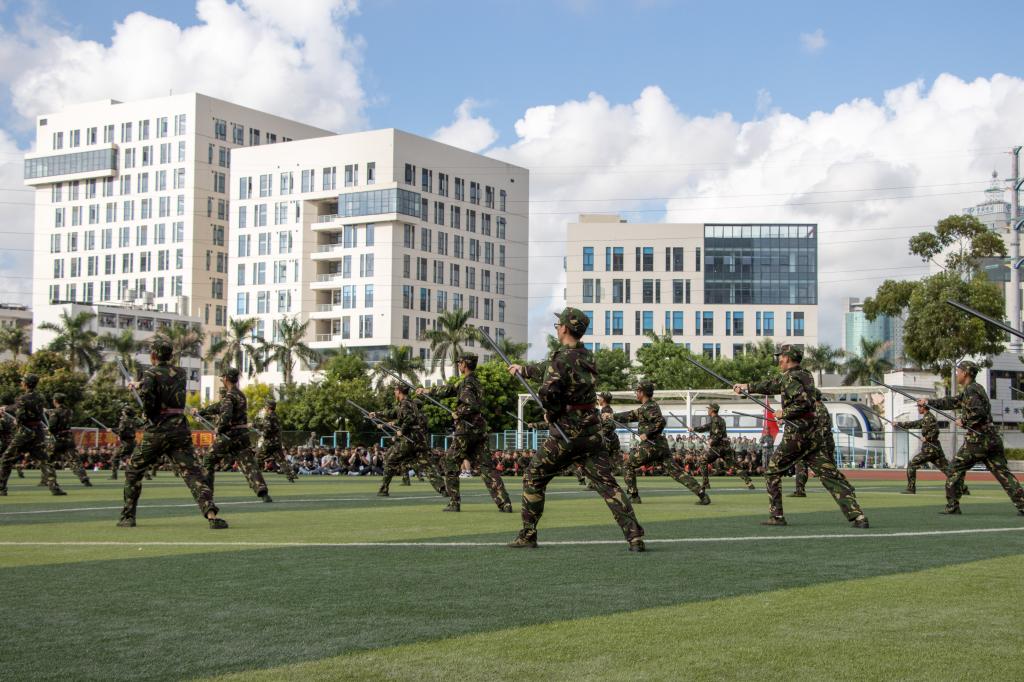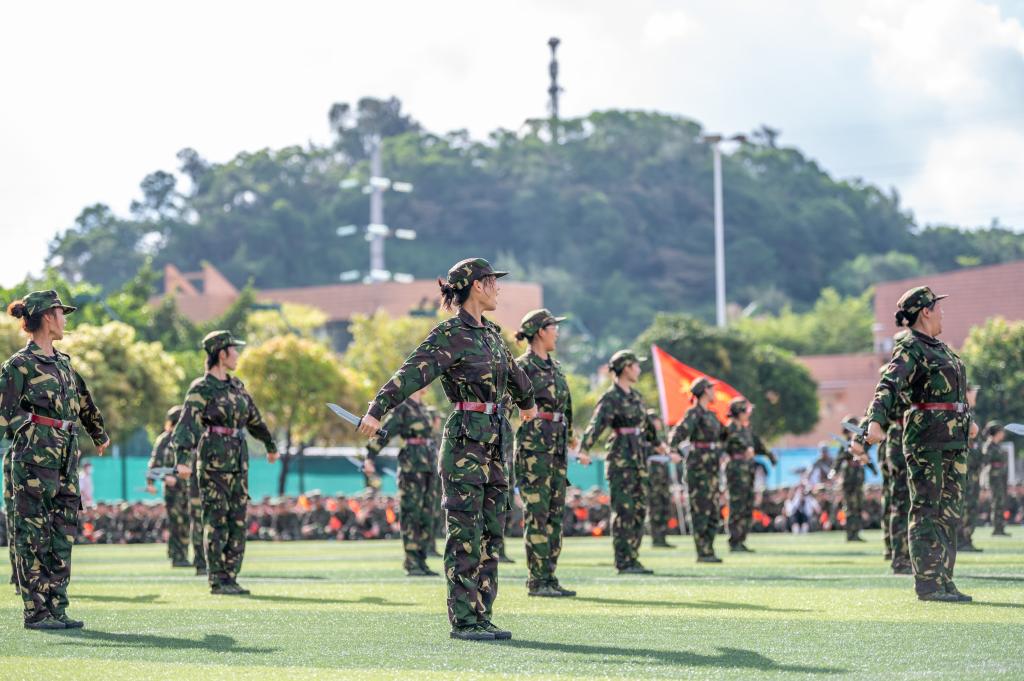 在匯報表演環(huán)節(jié),同學(xué)們表演了軍訓(xùn)隊列、男子捕俘拳、女子捕俘刀、男子應(yīng)急棍術(shù)、一招制敵、戰(zhàn)術(shù)小分隊演練、教學(xué)話劇《木棉花開》精彩片段、《沒有共產(chǎn)黨就沒有新中國》合唱等項目,高昂的士氣、挺拔的軍姿展現(xiàn)了同學(xué)們在軍訓(xùn)中刻苦訓(xùn)練的成果,贏得了全場陣陣掌聲。響亮的口號、高亢的歌聲展現(xiàn)了同學(xué)們聽黨話、跟黨走、報黨恩的深厚情感和使命擔(dān)當(dāng),鼓舞斗志,激動人心,催人奮進(jìn)。