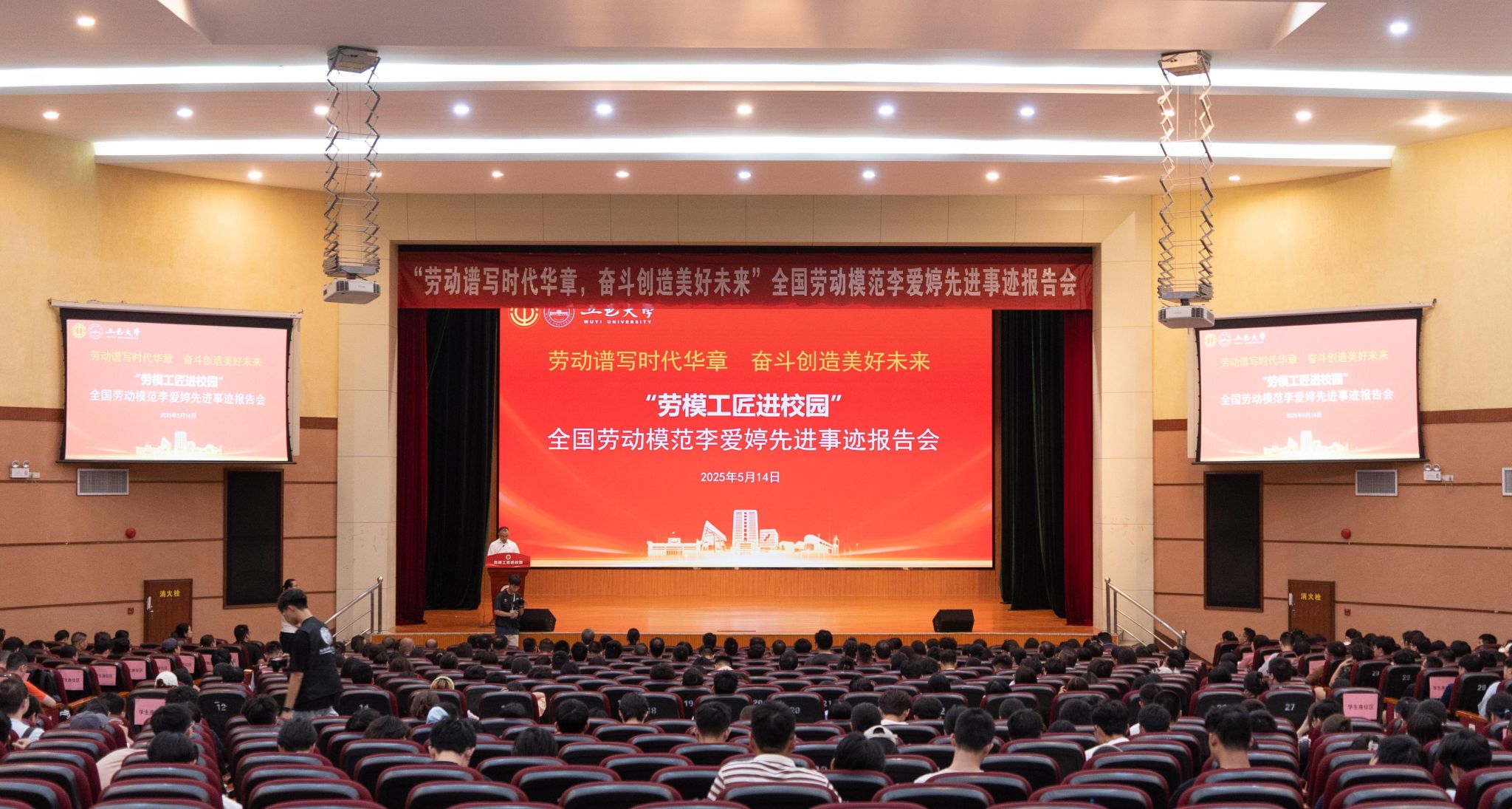 為深入貫徹落實習近平總書記在慶祝中華全國總工會成立100周年暨全國勞動模范和先進工作者表彰大會上的重要講話精神,積極響應全國總工會關于“勞模工匠進校園”行動的部署要求,5月14日,校工會、黨委教師工作部(教師教學發展中心)、教務處全面育人中心聯合在呂志和禮堂舉行全國勞動模范李愛婷先進事跡報告會。活動以“勞動譜寫時代華章,奮斗創造美好未來”為主題,通過全國勞動模范、外國語學院商務英語專業2005屆校友、中國電信股份有限公司江門蓬江區分公司黨委委員、副總經理、紀委書記李愛婷鮮活生動的勞模故事,引導師生深刻領悟勞模精神內涵,厚植家國情懷。校黨委常委、副校長、工會主席周飚出席并致辭,校工會委員會委員、二級工會主席及其委員、教師代表、學生代表500余人參加報告會。報告會由工會常務副主席徐煥立主持。