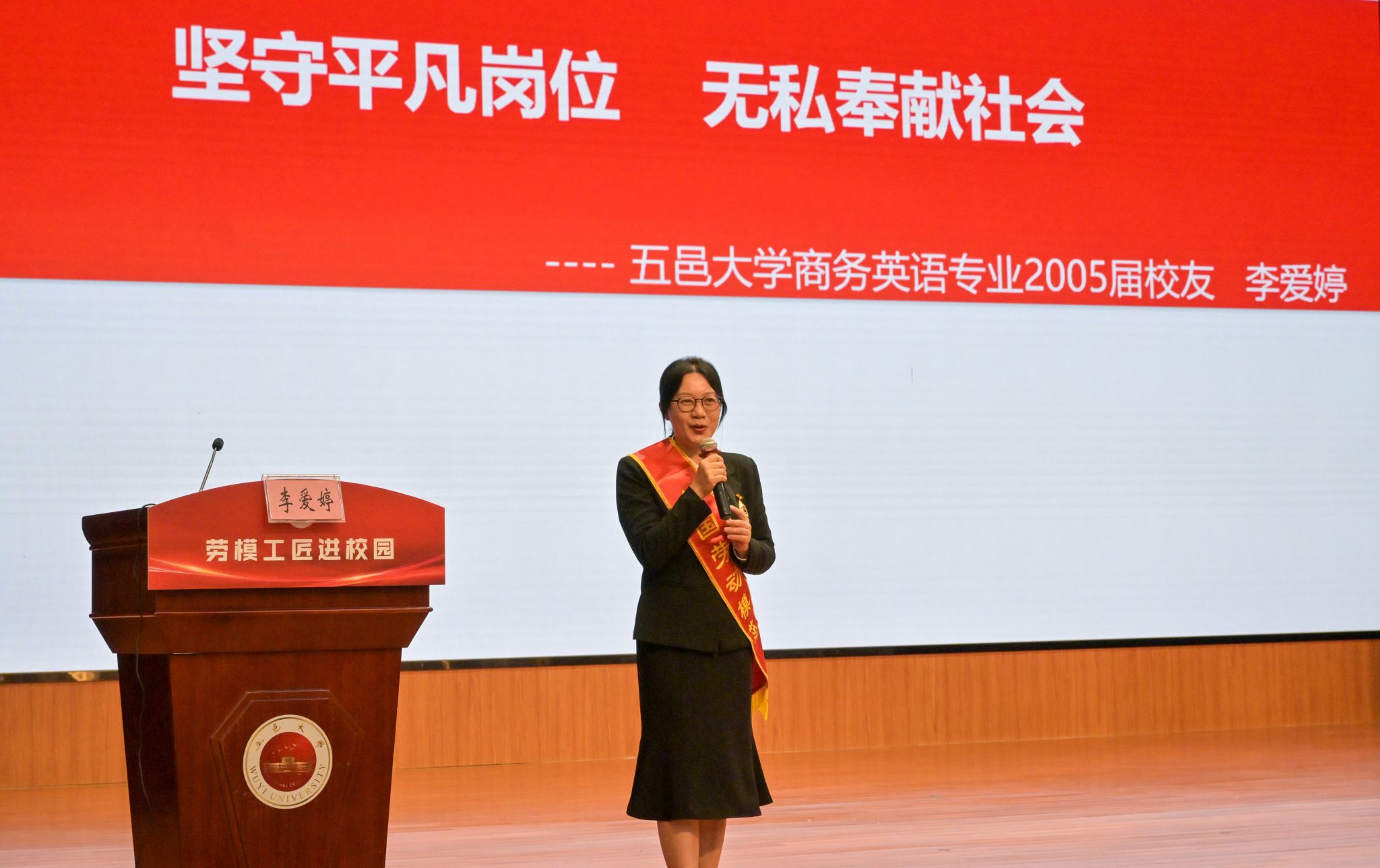 李愛婷以“堅守平凡崗位,無私奉獻社會”為題,分享了她的職業成長經歷。從一名普通外包員工到全國勞動模范,李愛婷用親身經歷展現了“勞動最光榮、勞動最崇高、勞動最偉大、勞動最美麗”的生動實踐。她勉勵青年學子以技能報國、用實干興業,在服務粵港澳大灣區建設中實現人生價值。