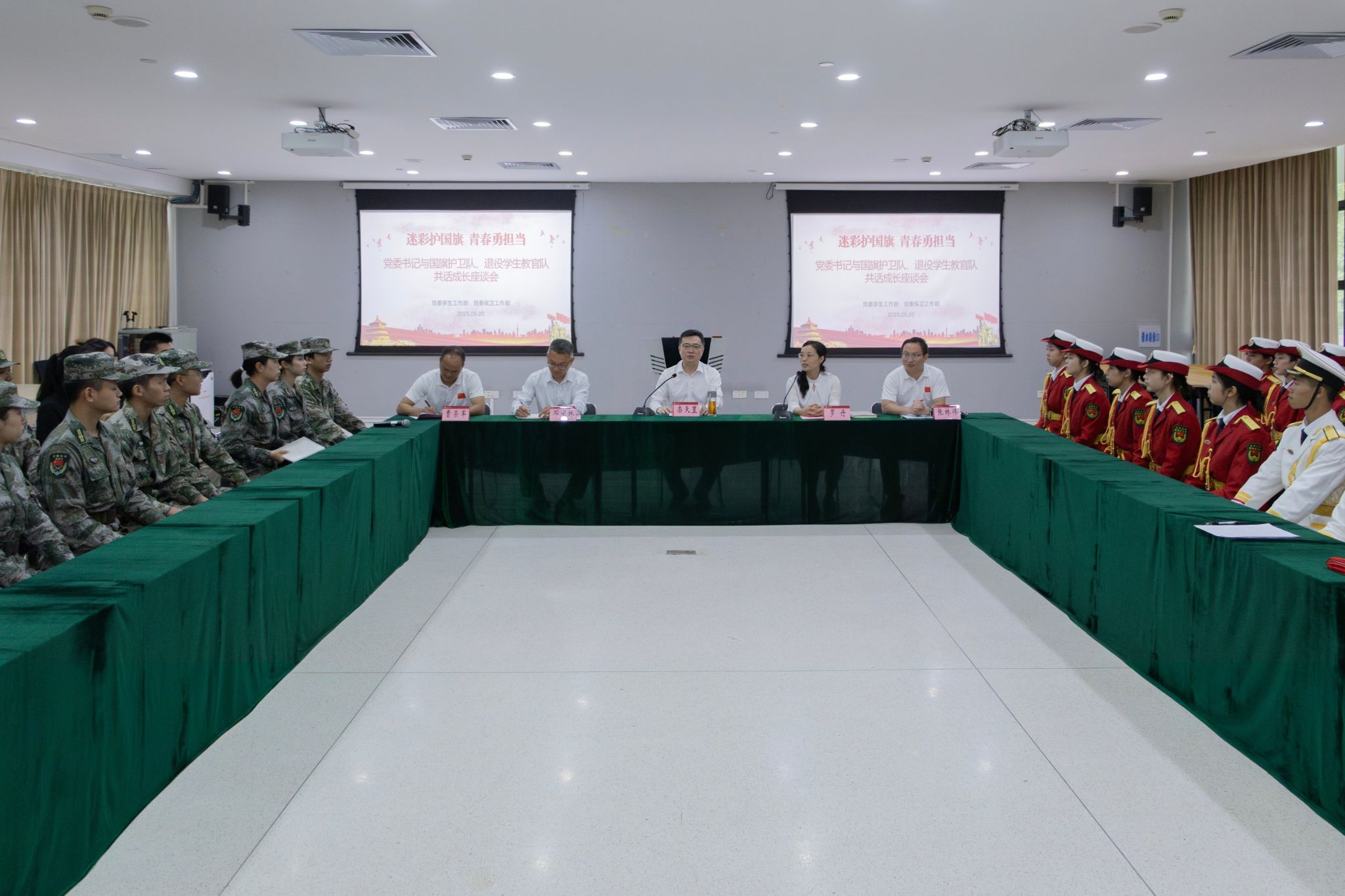 5月20日,校黨委書記欒天罡走進“一站式”學生社區,在學生綜合服務中心209會議室召開以“迷彩護國旗 青春勇擔當”為主題的座談會,黨委學生工作部、黨委保衛工作部有關負責同志,學校軍事理論教研室、“邑聲戎耀”輔導員工作室教師代表,國旗護衛隊、退役學生教官隊學生骨干參加了此次座談會。