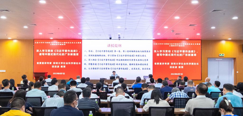 田啟波介紹了《習近平著作選讀》第一卷、第二卷的編輯出版與框架篇目,闡明了編輯出版、學習貫徹《習近平著作選讀》的重大意義,深入講解了《習近平著作選讀》所反映的新時代背景及其偉大變革,全面闡釋了《習近平著作選讀》的豐富內涵和精神實質,結合學習貫徹習近平總書記視察廣東重要講話、重要指示精神,強調要全面系統學、融會貫通學、聯系實際學、帶著問題學、在調查研究中學,推動學習宣傳貫徹《習近平著作選讀》走深走實、務求實效。報告政治站位高、論述精辟深刻、講解生動鮮活,具有很強的指導性、針對性、啟發性,為學校廣大黨員干部和師生深入學習貫徹習近平新時代中國特色社會主義思想提供了寶貴指導。