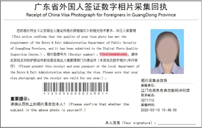 2.廣東省外國人簽證數字相片采集回執(如下圖)、照片2張。